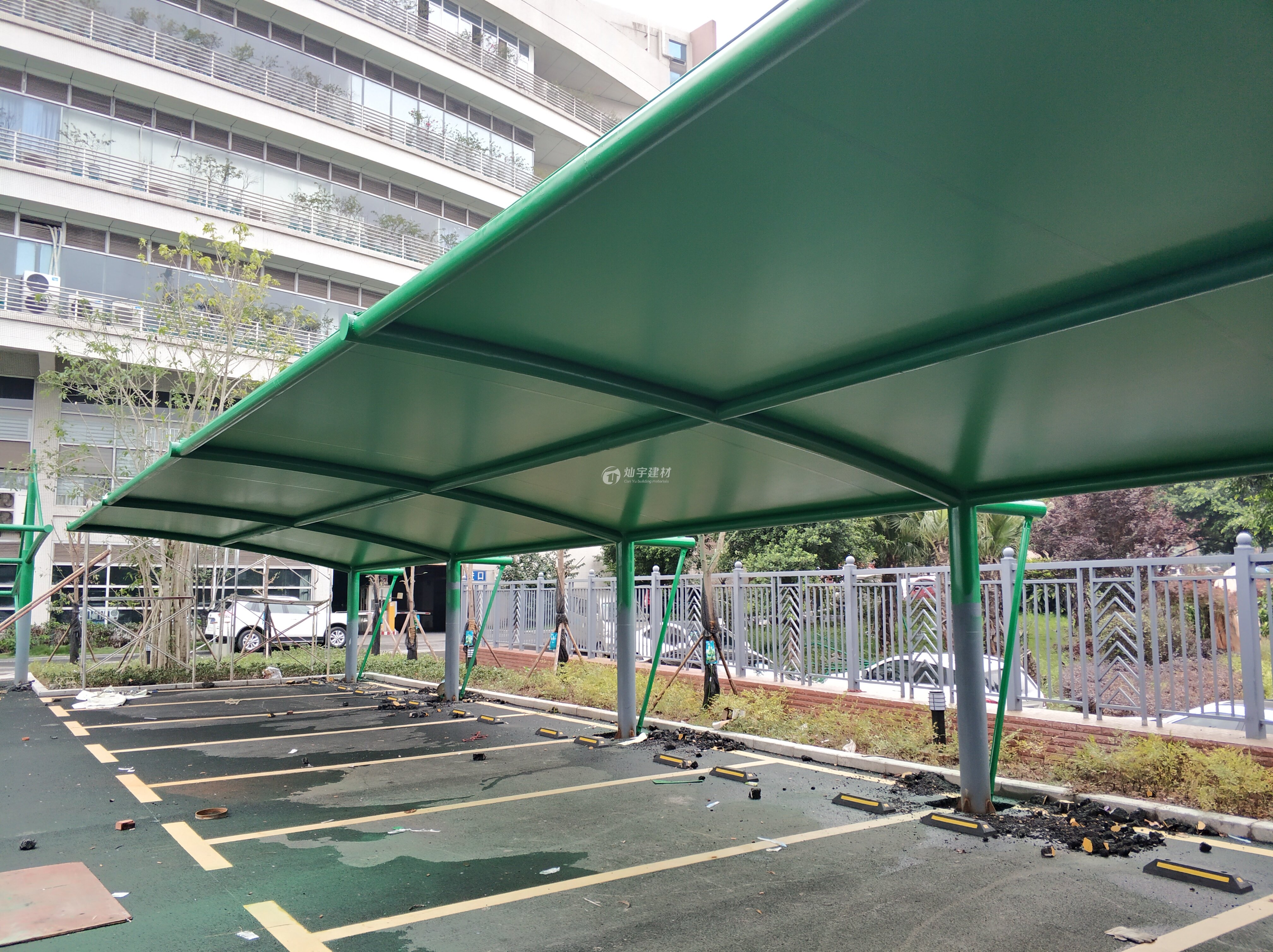 燦宇多色系膜材照片 昆山某園林公司綠色膜結構車棚安裝完畢,綠色膜結構跟園林公司綠色環保理念很搭調,受到客戶上下一致認同,燦宇彩色膜結構車棚,還有其它顏色可選,紅黃藍綠青蘭紫迷彩色滿足不同客戶的個性審美需求,為單調的白色膜結構車棚市場增加一點新意創意. 如有需要請致電熱線400-799-8099蘇州燦宇車棚